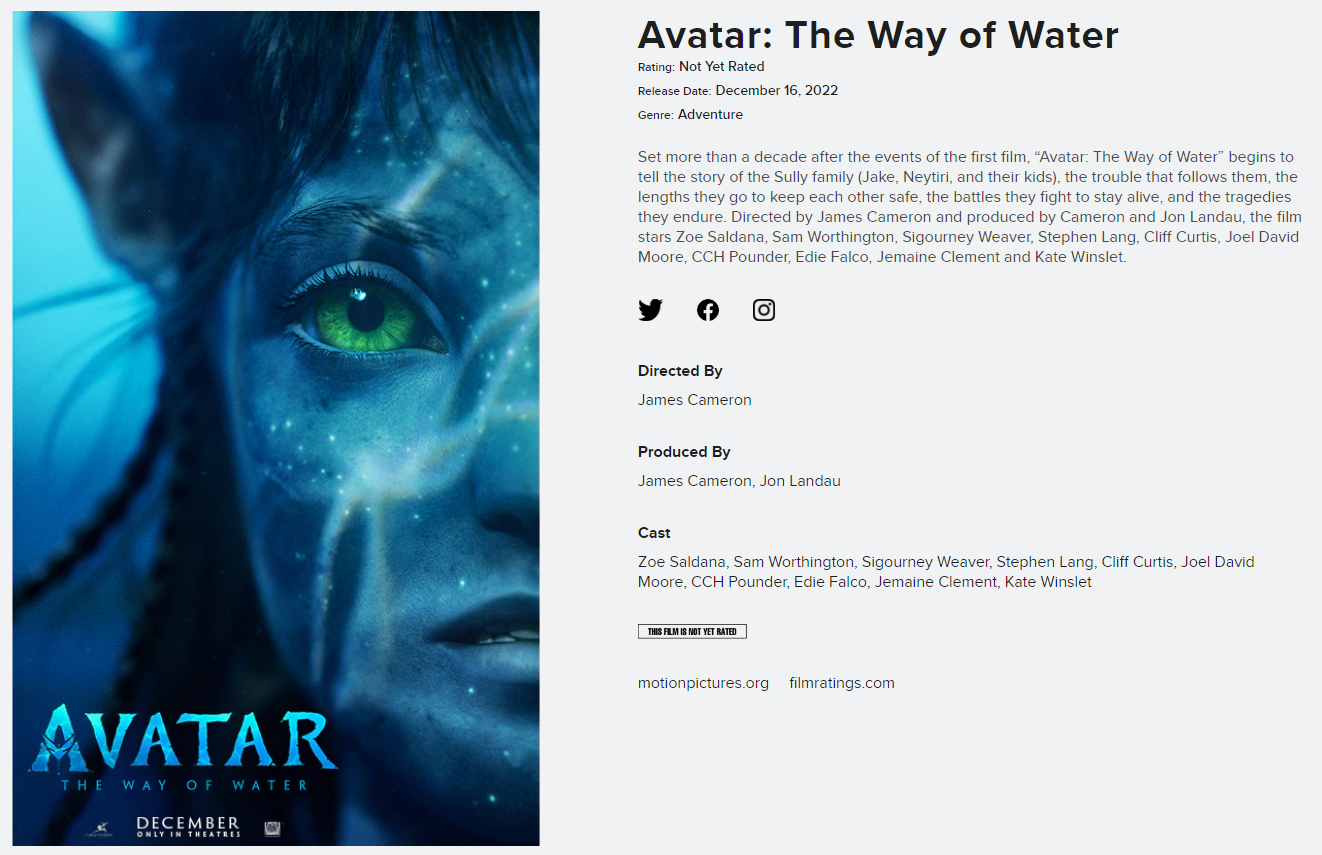 첫 번째 영화의 사건 이후 10년이 넘는 시간을 배경으로 한 "Avatar: Way of Water"는 Sully 가족(Jake, Neytiri, 그리고 그들의 아이들)과 그들을 따라가는 문제, 그들이 가는 길에 대한 이야기를 시작합니다. 서로를 안전하게 지키기 위해, 살아남기 위해 싸우는 전투와 그들이 견뎌야 하는 비극. James Cameron이 감독하고 Cameron과 Jon Landau가 제작한 이 영화에는 Zoe Saldana, Sam Worthington, Sigourney Weaver, Stephen Lang, Cliff Curtis, Joel David Moore, CCH Pounder, Edie Falco, Jemaine Clement 및 Kate Winslet이 출연합니다.