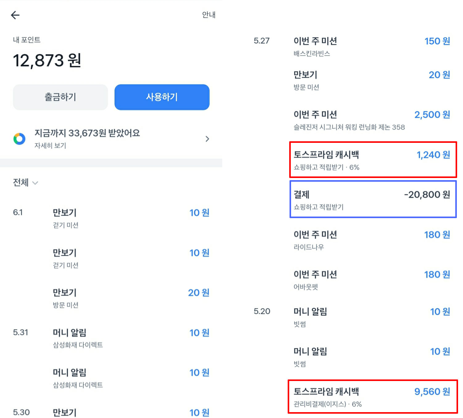 저는 2달 전부터 아파트 관리비 결제 후 캐시백을 받았습니다. 이런 저런 미션등을 통해 적립한 포인트들도 꽤 되네요. 그리고 내 계좌로 출금해도 되지만, 바로 쇼핑을 해도 됩니다. 위 이미지의 파란 박스가 포인트로 결제한 내역입니다.